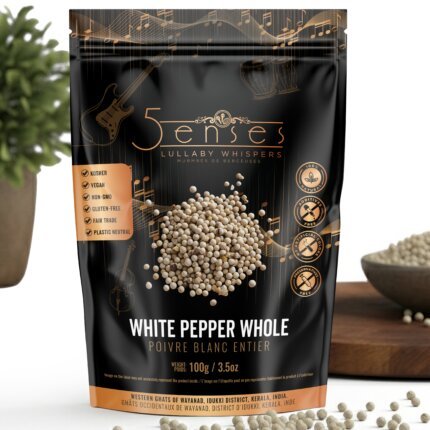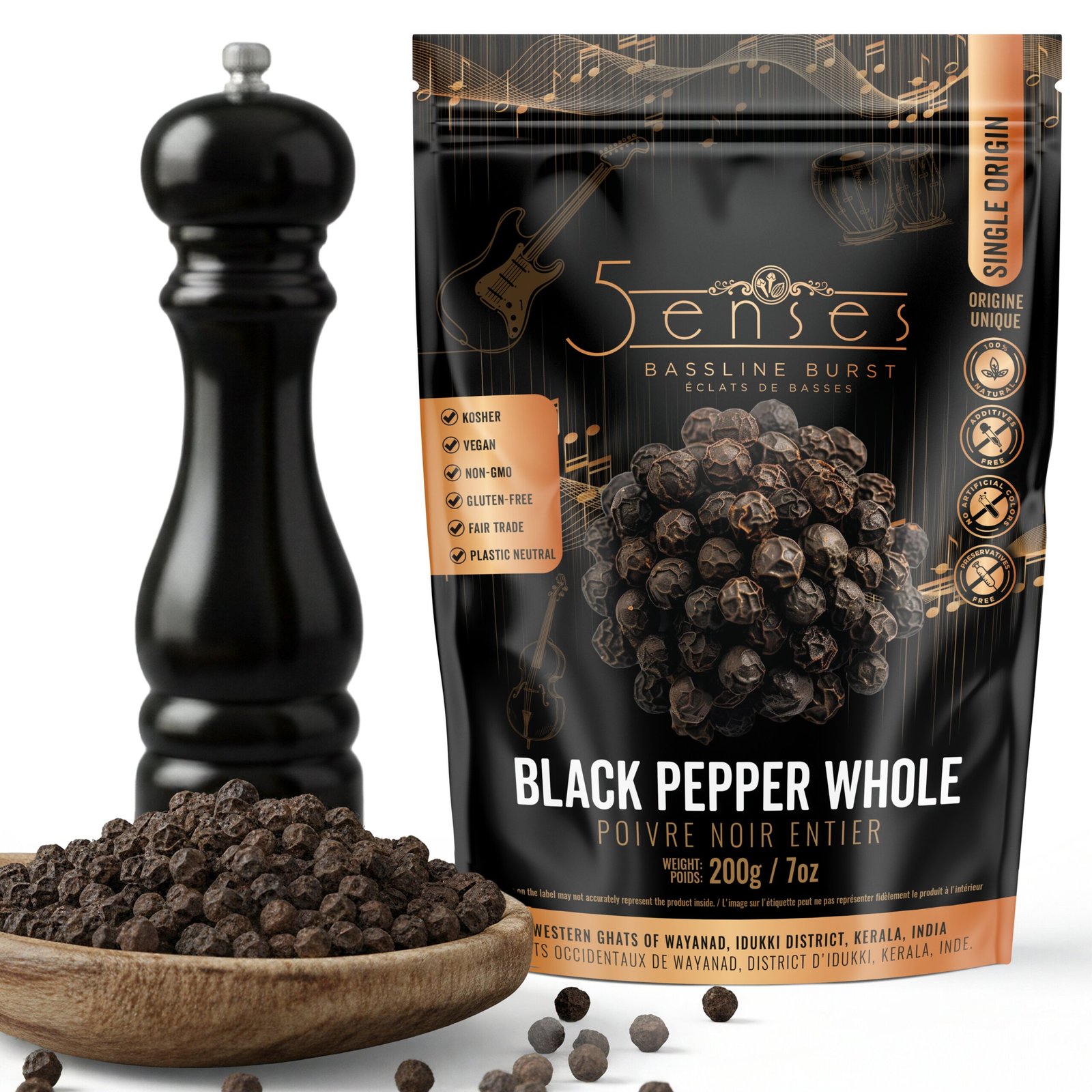Step into the bassline burst of 5Senses SINGLE ORIGIN Whole Black Pepper born in the Malabar region of India over 4000 years ago. Each peppercorn pulses with complex, woody, and citrusy notes for your culinary symphony.